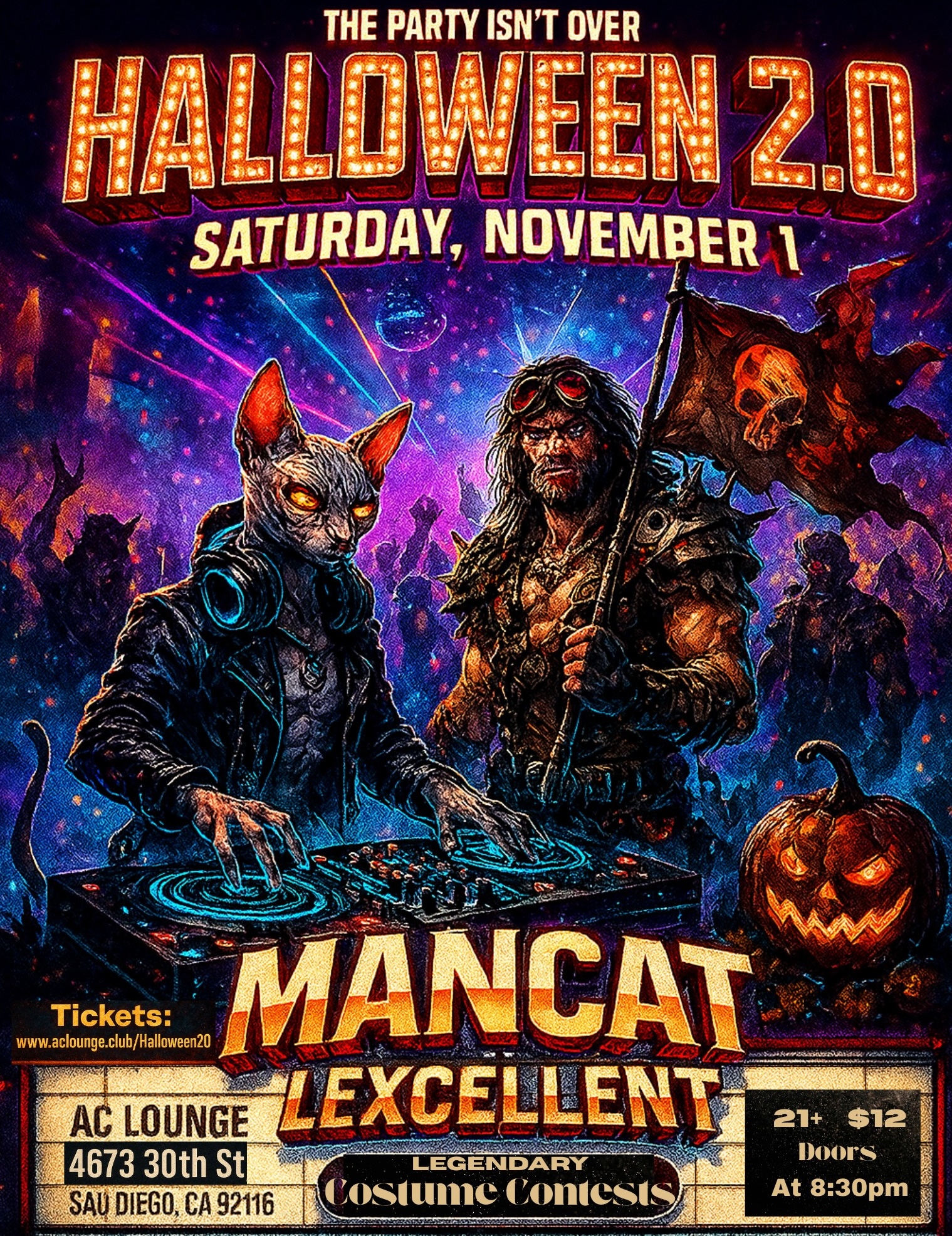 We've been working hard over the last 21 years to provide you the coolest dancefloor in San Diego. We're excited to offer you this incredible night of music and cocktails with DJ Mancat, a long-tmie friend of the AC Lounge that has spun here countless times, including several New year's Eve parties.
